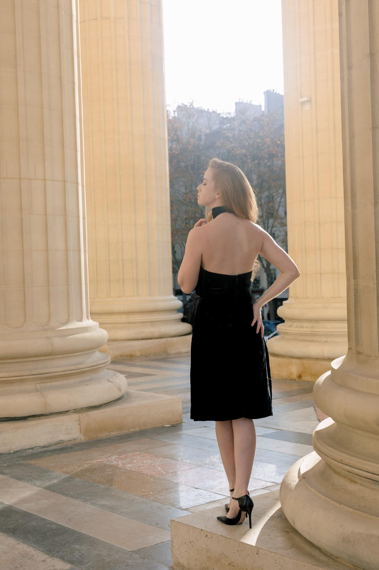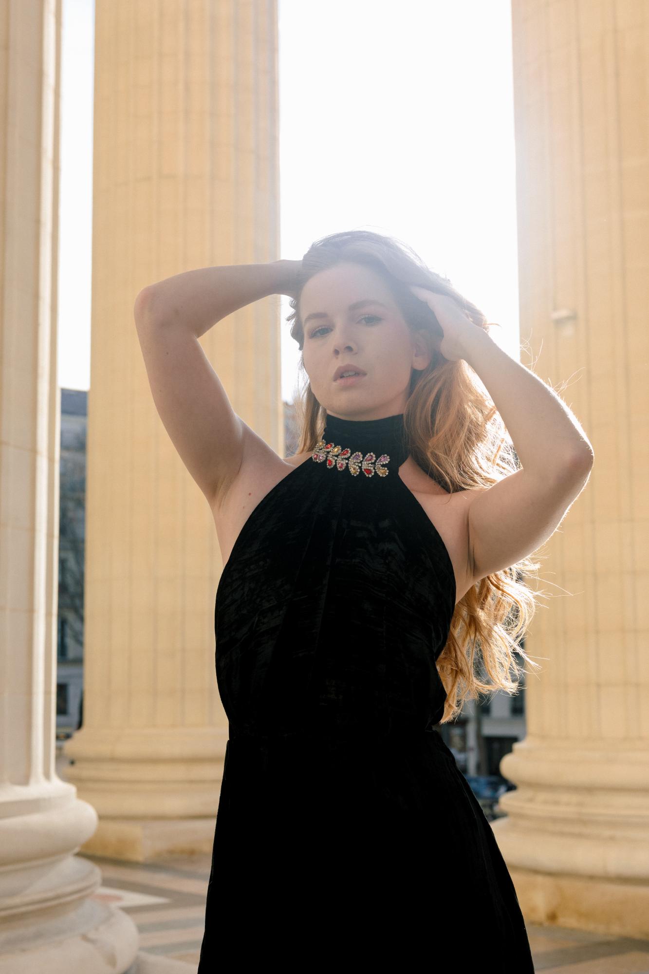 Robe de soirée au design halter, confectionnée dans un tissu en mohair doux et fluide, offrant une allure élégante et un tombé raffiné.