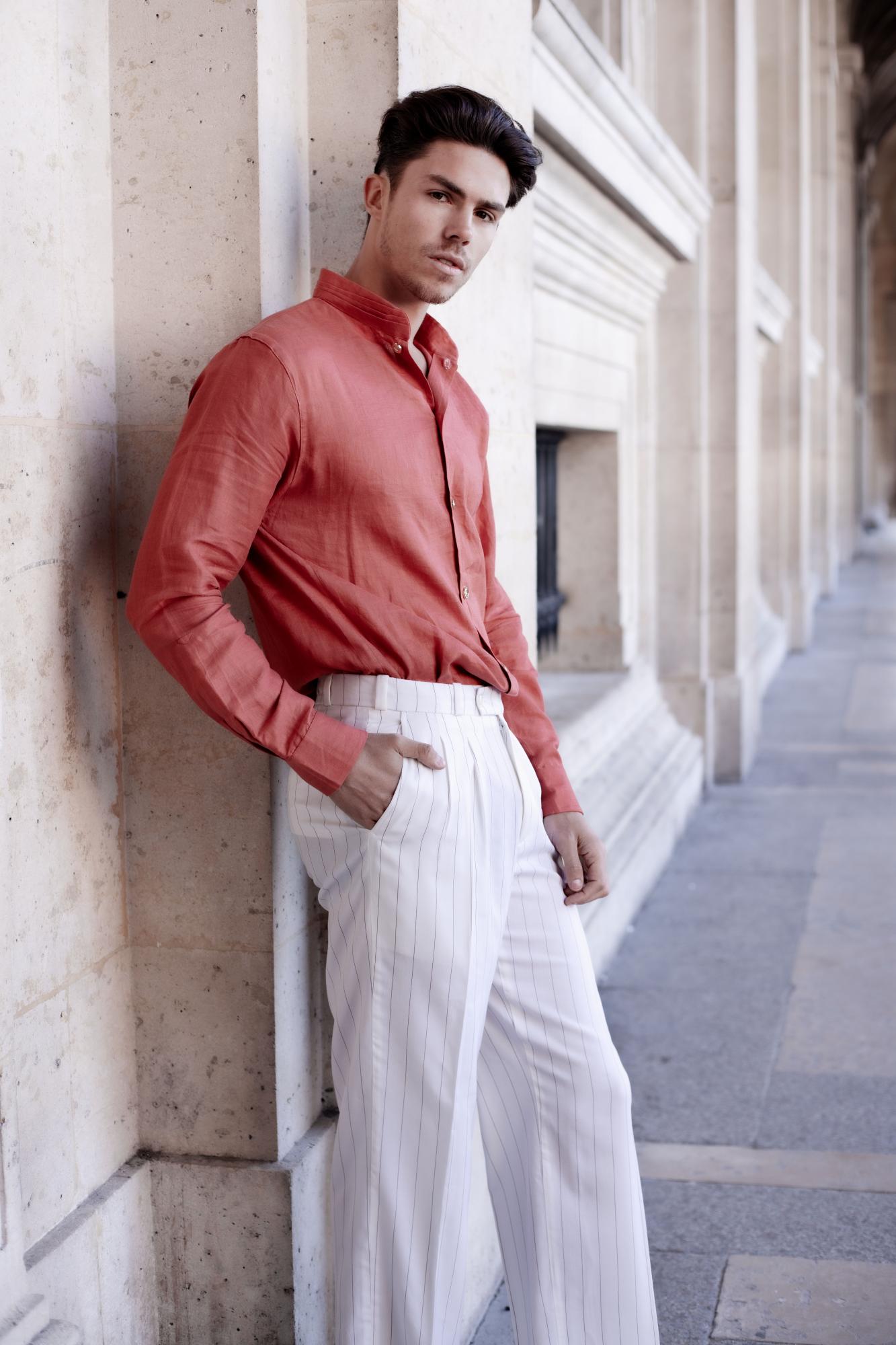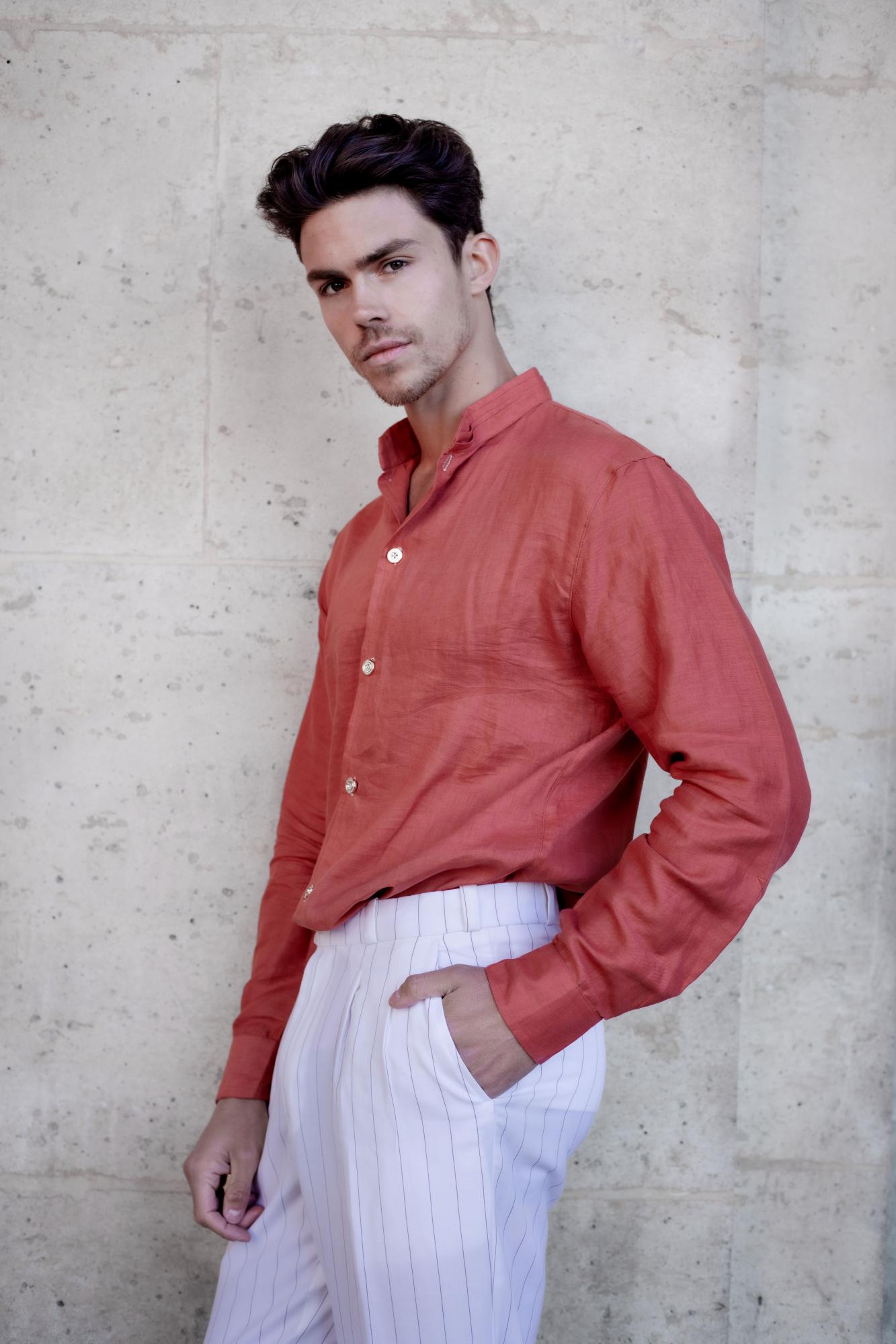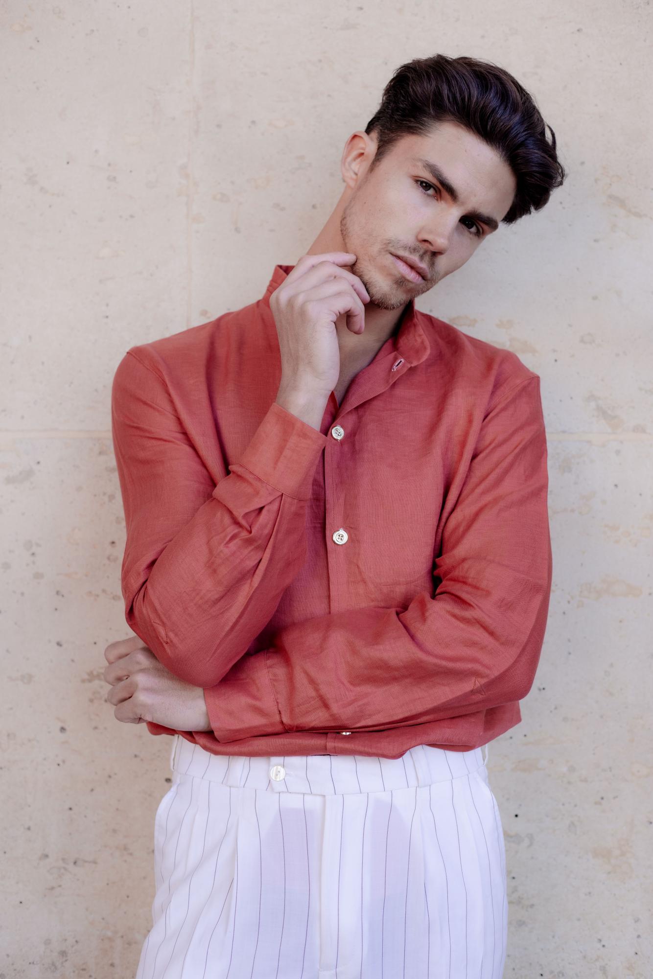 Confectionnée en 100% lin italien, cette chemise se distingue par sa teinte unique entre rouge profond et nuances terreuses, offrant une allure chaleureuse et sophistiquée.